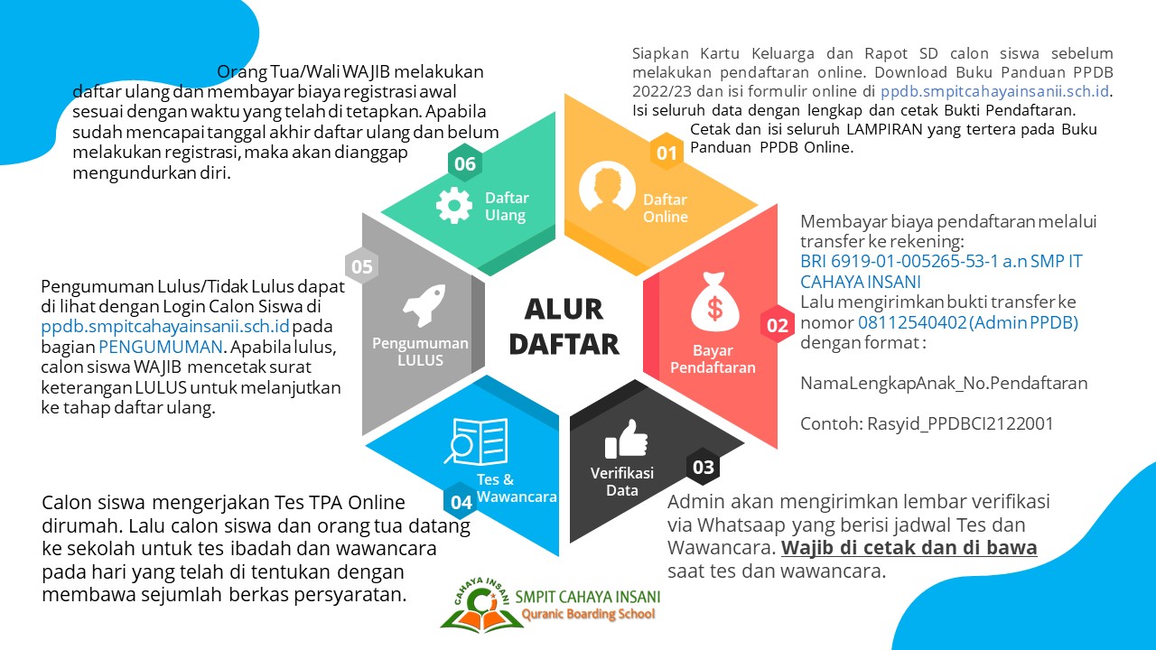 SMP Islam Terpadu Cahaya Insani Kedu menyediakan PPDB secara online diharapkan proses PPDB dapat berjalan cepat dan bisa dilakukan dimanapun dan kapanpun selama sesi PPDB Online dibuka. Proses pendaftaran calon siswa juga menggunakan formulir konvensional yang terdapat pada lampiran Buku Panduan PPDB untuk kelengkapan data di dapodik.